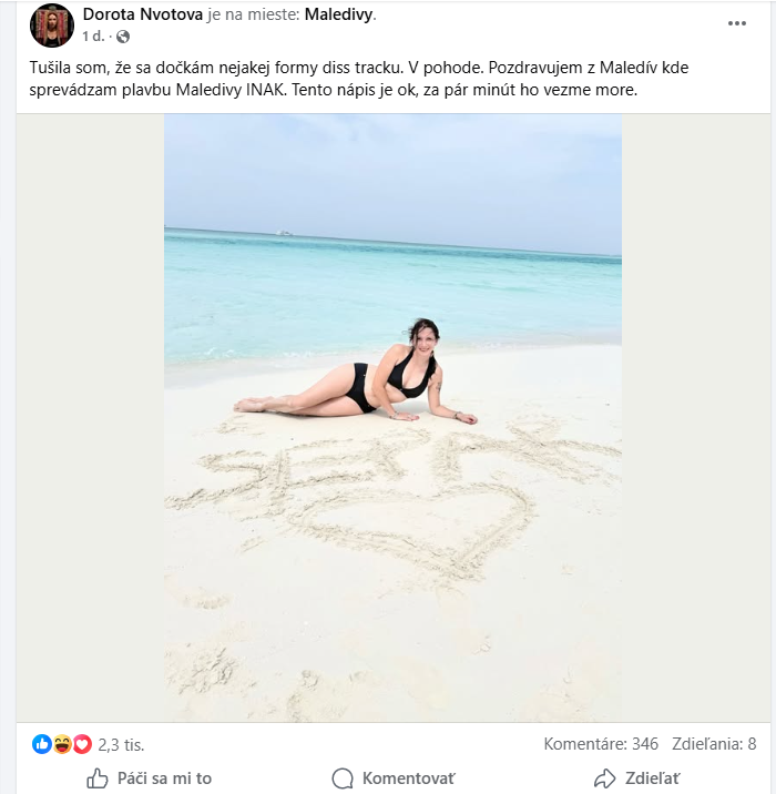Dorota Nvotová tento diss zaregistrovala a zvolila reakciu, ktorá je celkom opačná - v ostrom kontraste s agresívnou skladbou. Na svojom Facebooku zverejnila fotografiu z pláže na Maldivách, kde pózuje pri mene Separ napísanom do piesku.