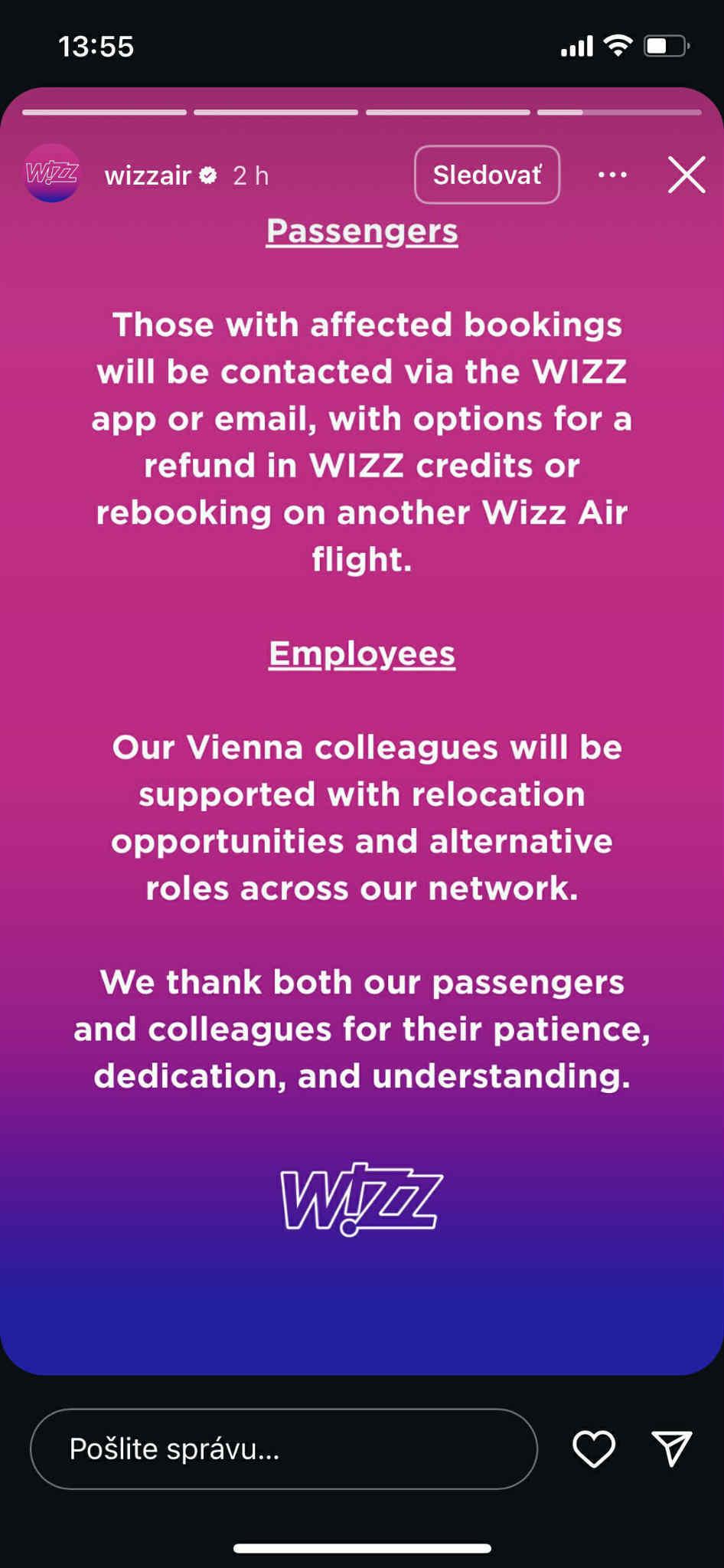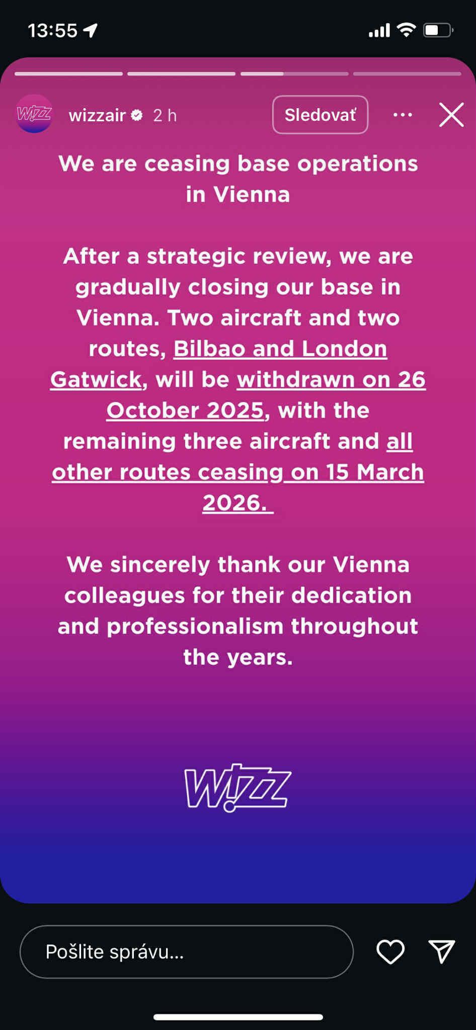 Spoločnosť oznámila svoj odchod zo Schwechatu na Instagrame. Wizz Air je po spoločnosti Ryanair snáď najobľúbenejšia nízkonákladovka aj slovenských cestovateľov. Ponúka totiž letenky za pár desiatok eur do profanovaných destinácií. Všetky linky prevádzkované týmto dopravcom budú k 15. marcu zrušené.
