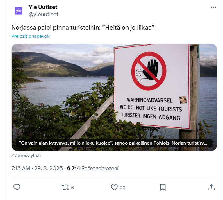 Na cestnej križovatke neďaleko Tromsø stojí veľká tabuľa s nápisom: „Nemáme radi turistov.“ Je v angličtine aj v nórčine. O kúsok ďalej je ďalší podobný nápis a potom ešte tretí. Mesto, ktoré je takmer rovnako veľké ako fínske Rovaniemi, navštívi viac než dvakrát toľko turistov ako fínske mesto ležiace na polárnom kruhu, píše fínsky portál Yle.