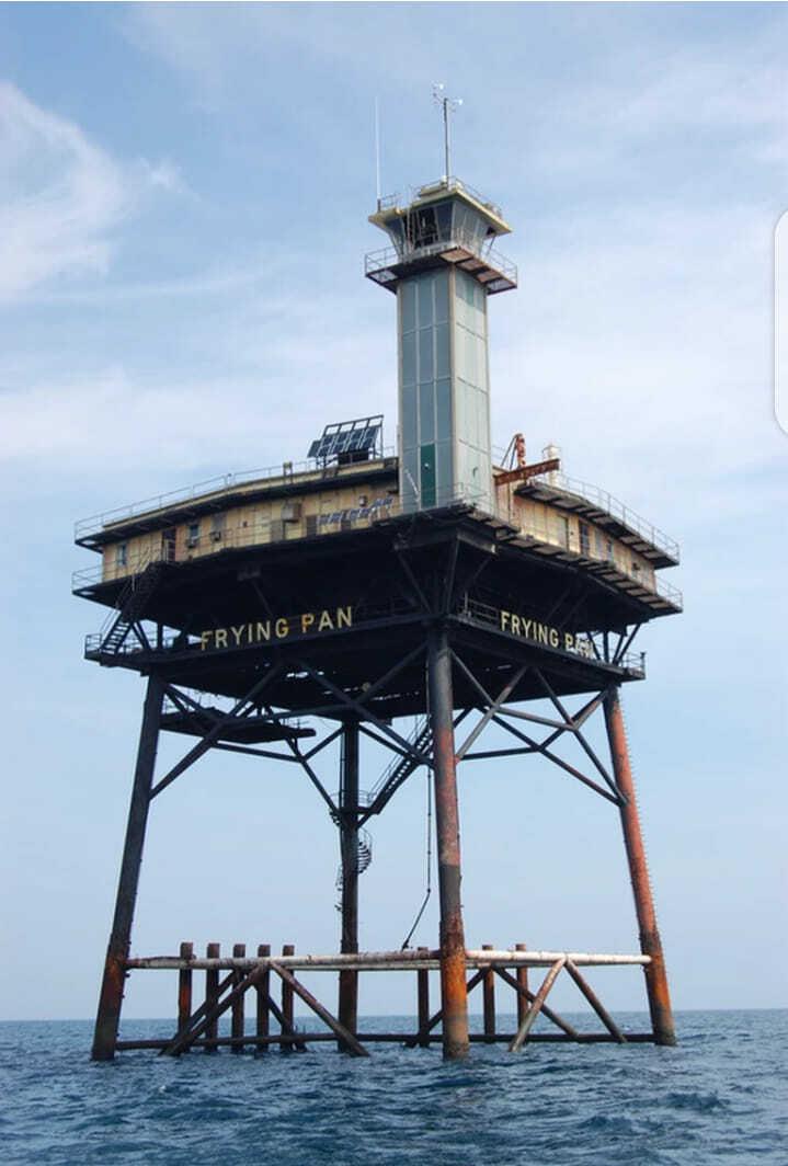 Frying Pan Tower stojí 26 metrov nad hladinou mora a pôvodne slúžil ako navigačná pomôcka pre lode. Okolo roku 2000 ho vyradili z prevádzky a v roku 2012 ho v aukcii získal súkromný majiteľ. Dobrovoľníci mu odvtedy vdýchli nový život – nie luxusný, ale autentický a dobrodružný.
