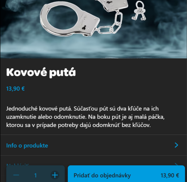 Okrem obľúbeného talianskeho jedla máš v rámci objednávky na výber ešte jednu kategóriu - pre nezbedných. K svojej pizzi si tak môžeš rovno objednať kovové putá za 13,90 eura, coquette obojok na krk za 23,90 eura či kožený bič za 21,90 eura.