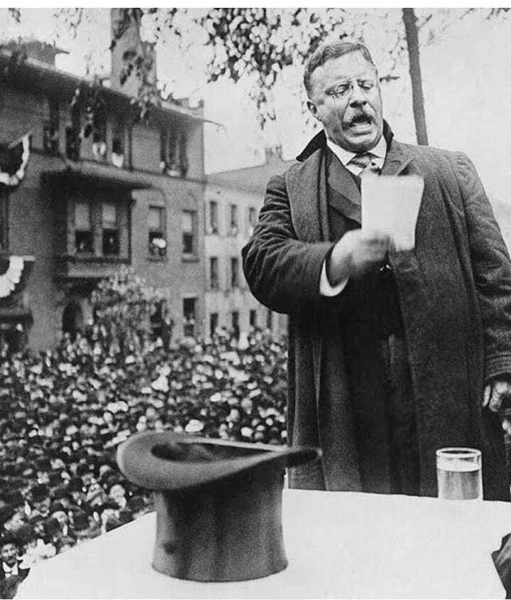 Theodore Roosevelt bol na predvolebnú kampaň v Milwaukee, keď ho atentátnik postrelil do hrude. Guľku spomalil 50-stranový prejav vo vrecku. Krvácal, no namiesto nemocnice vystúpil pred dav. „Na zabitie losa s byvolou silou treba viac než toto,“ zahlásil a ukázal dieru v papieroch. Potom 84 minút hovoril s guľkou v tele. Takýto mix tvrdohlavosti a charizmy je dôvod, prečo dodnes patrí k najlegendárnejším americkým prezidentom.