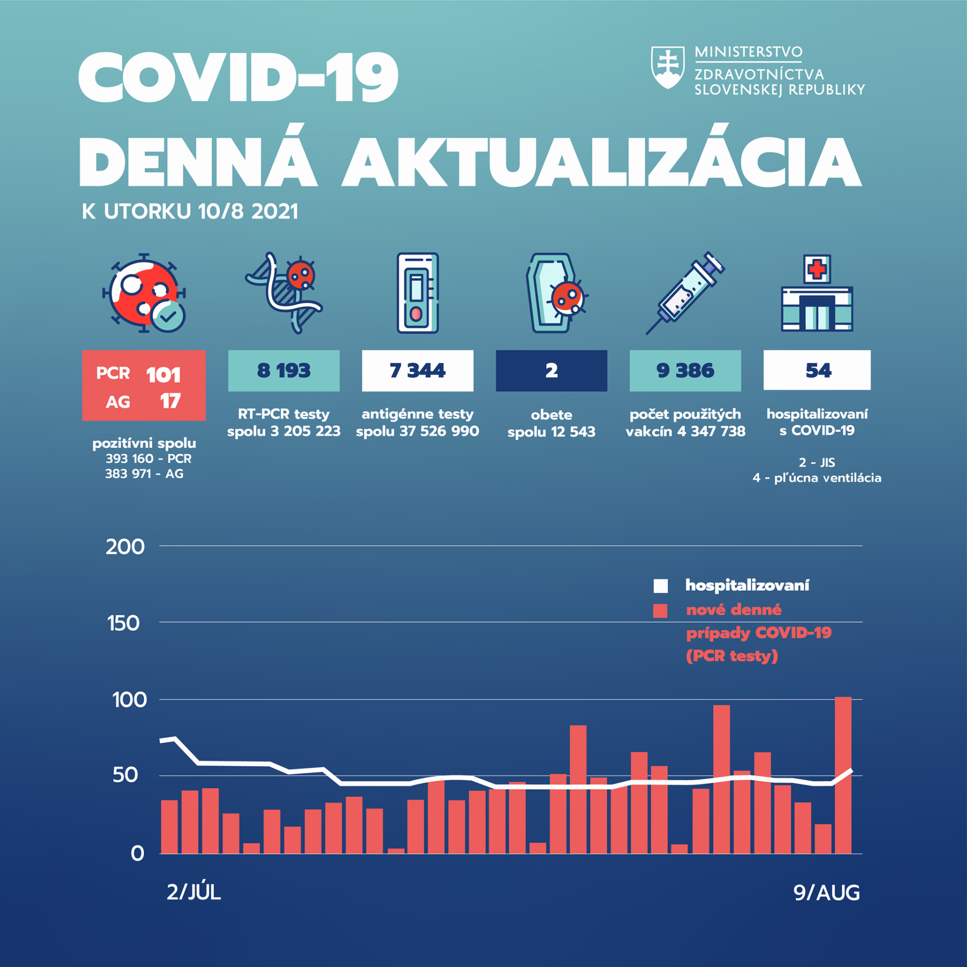 Na Slovensku za uplynulý deň pribudlo 101 pozitívne testovaných ľudí formou RT-PCR testov a 17 pozitívne testovaných antigénnymi testami. Včera bolo ukončených 8 193 RT-PCR vyšetrení a 7 344 antigénnych testov.