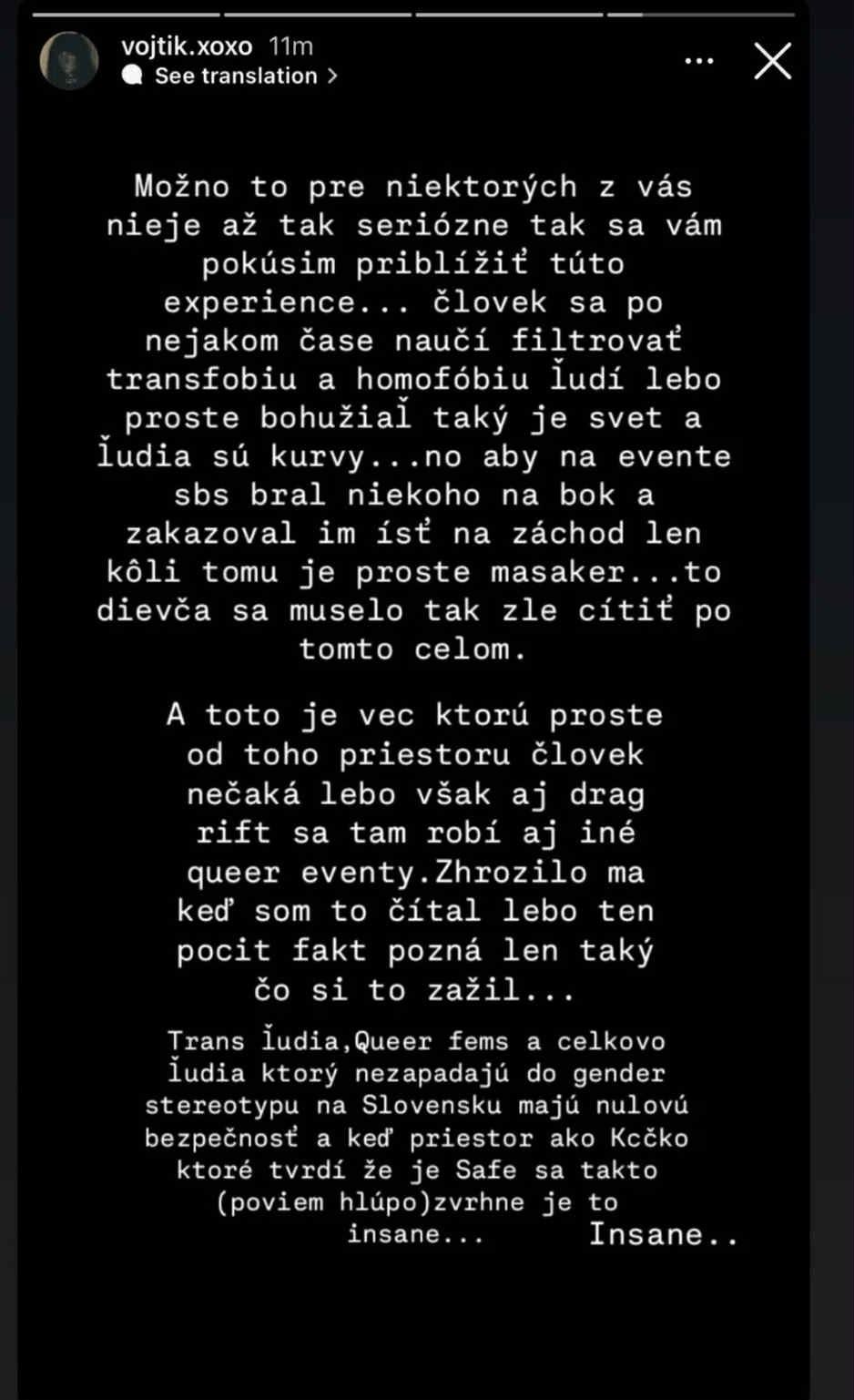 „Človek sa po nejakom čase naučí filtrovať transfóbiu a homofóbiu, lebo taký je svet... no aby na evente SBS brala niekoho na bok a zakazovala im ísť na záchod len kvôli tomu, je masaker.“ Zároveň dodal, že to od Kácečka nečakal, keďže klub pravidelne hostí drag a queer eventy.