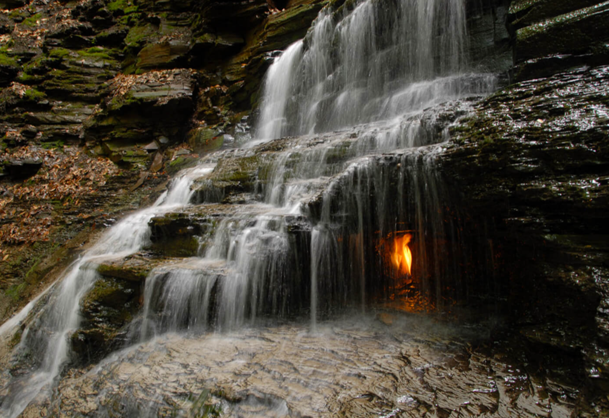 Súboj večného ohňa a nekonečnej vody sledujú turisti v Chestnut Ridge Parku v USA. Večný plameň pri vodopáde Eternal Flame Falls neďaleko Erijského jazera dosahuje len štyri až osem centimetrov. V jaskynke za 10-metrovým kaskádovým vodopádom navyše niekedy nemusí horieť, a preto si turisti musia priniesť zapaľovač a s veľkou opatrnosťou môžu sami zapáliť zemný plyn unikajúci z pukliny bridlicového podložia.